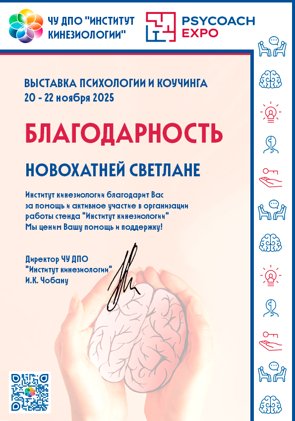 Психотерапевтический кинезиолог, телесно- ориентированый психолог, специалист по кинерджетике F. Rafferty, куратор: практических занятий, стажировок и группы студентов психотерапевтической кинезиологии Института кинезиологии.