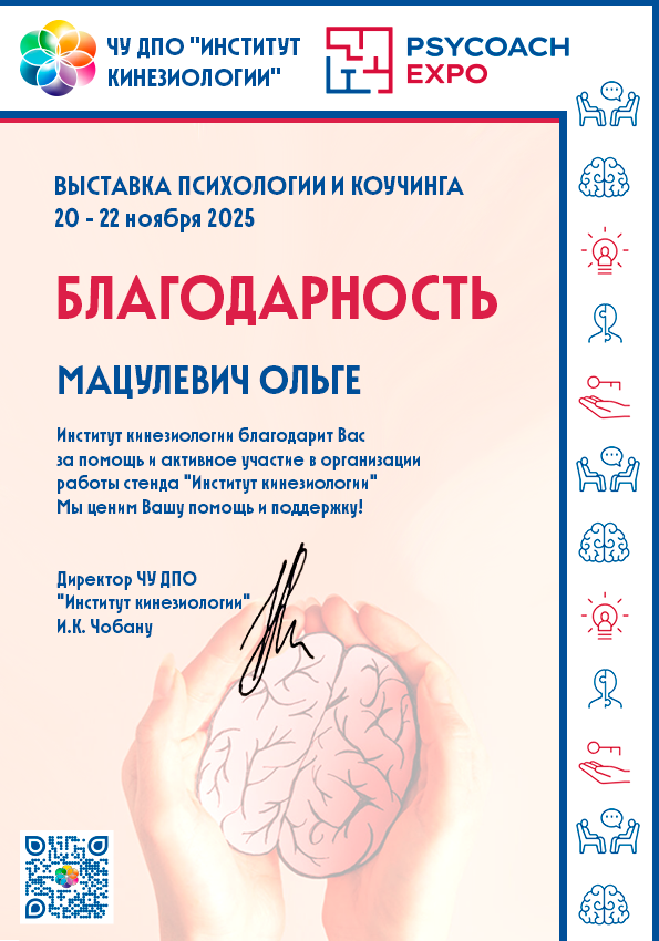 • Сертифицированный специалист по психотерапевтической кинезиологии.