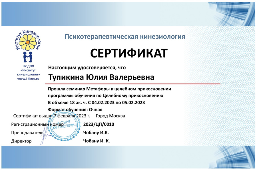 - Целебное прикосновение (ЦП): работа с системой мыщца-орган-меридиан;