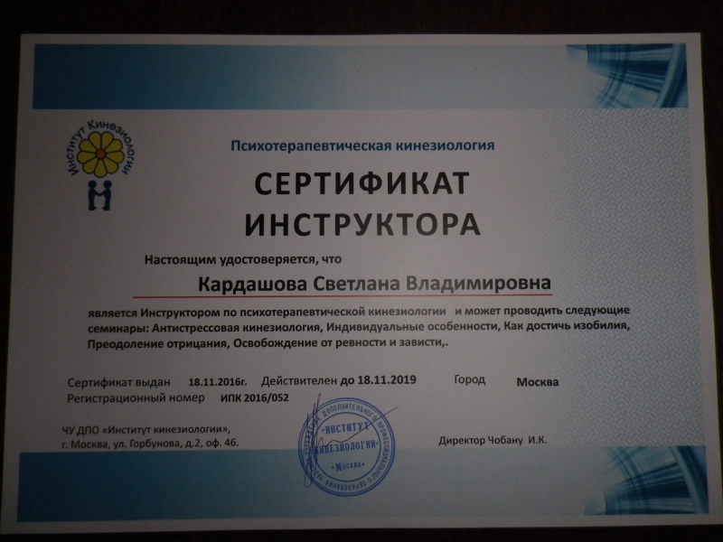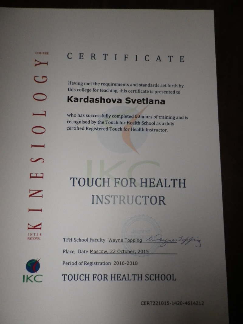 сертификат инструктора по Целебному прикосновению