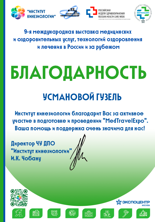 Благодарность за участие в 9-ой международной выставке медицинских и оздоровительных услуг, технологий оздоровления и лечения в России и за рубежом