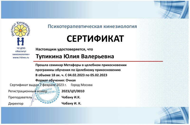 - Целебное прикосновение (ЦП): работа с системой мыщца-орган-меридиан;